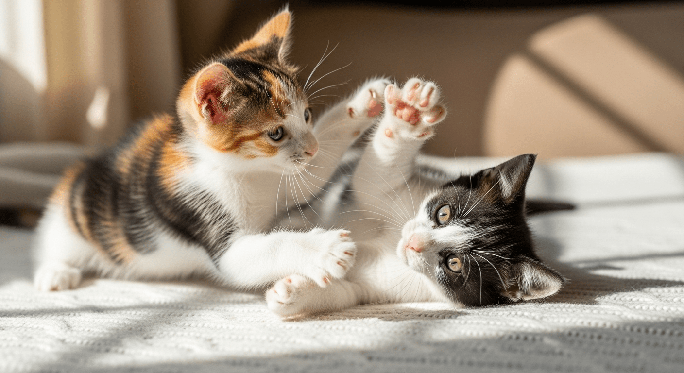 プロンプト「二匹の子猫,三毛猫とハチワレ,じゃれ合っている」