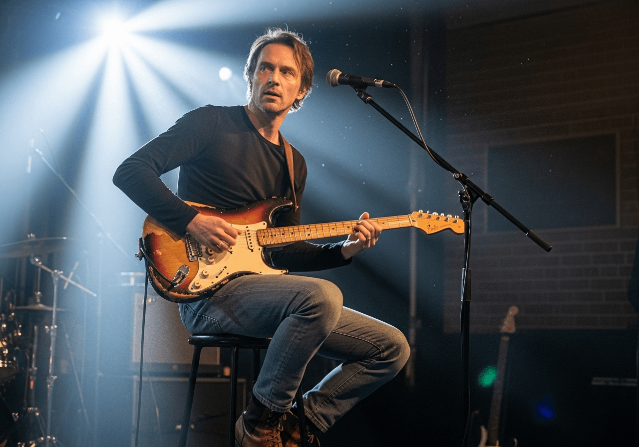 プロンプト「40代の男性,やせ型,エレキギターを弾いている,ギターはビンテージのストラトキャスター,場所はライブハウス,高めの椅子に座っててスポットライトに当たっている」
