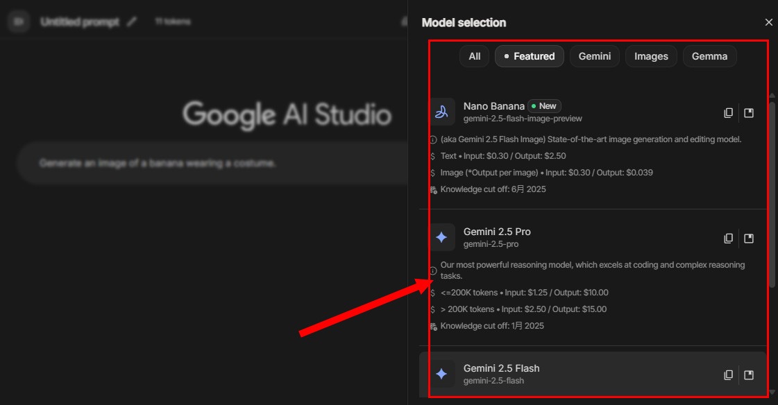 初期設定は「Nano Banana」ですが、普通にチャットでやり取りする場合は「Gemini 2.5 Flash」で良いかと思います(Proは高性能らしいですが、有料っぽい表記があるので未確認です)