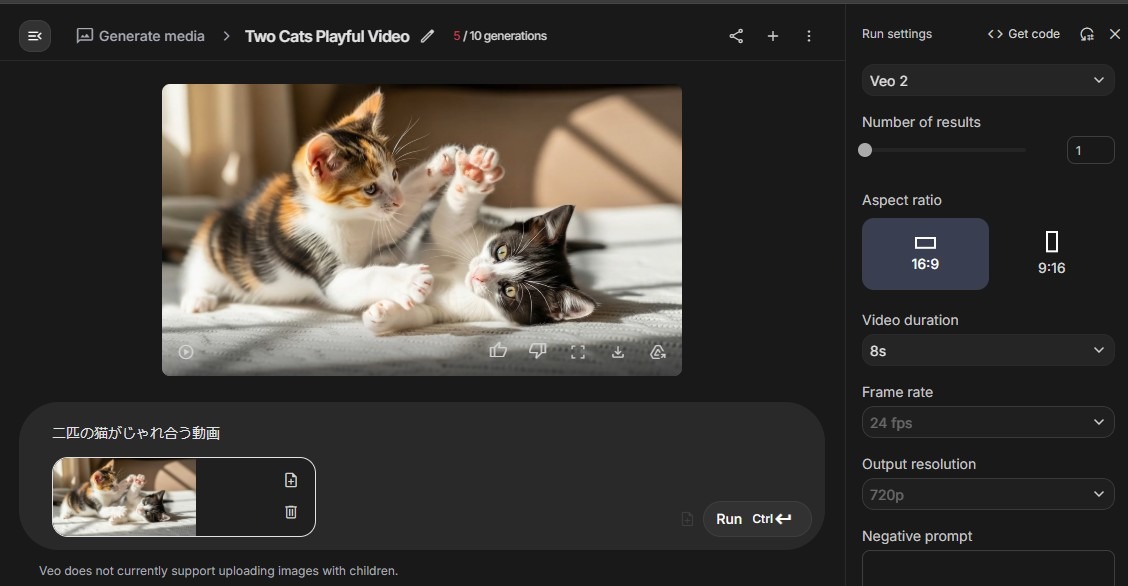 例えば先ほどの「Imagen4」で生成した猫の画像を「Veo2」にアップロードし、プロンプトを入れると