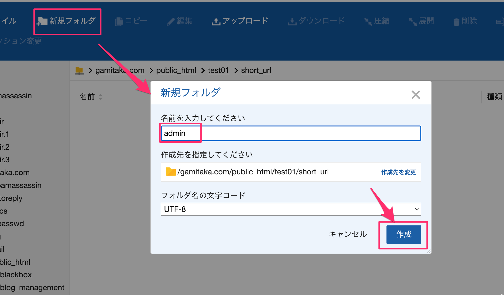 5.「新規フォルダ」を作成→「admiin」という名前のフォルダを作成します。