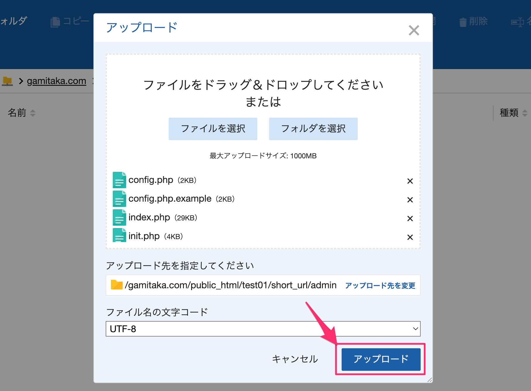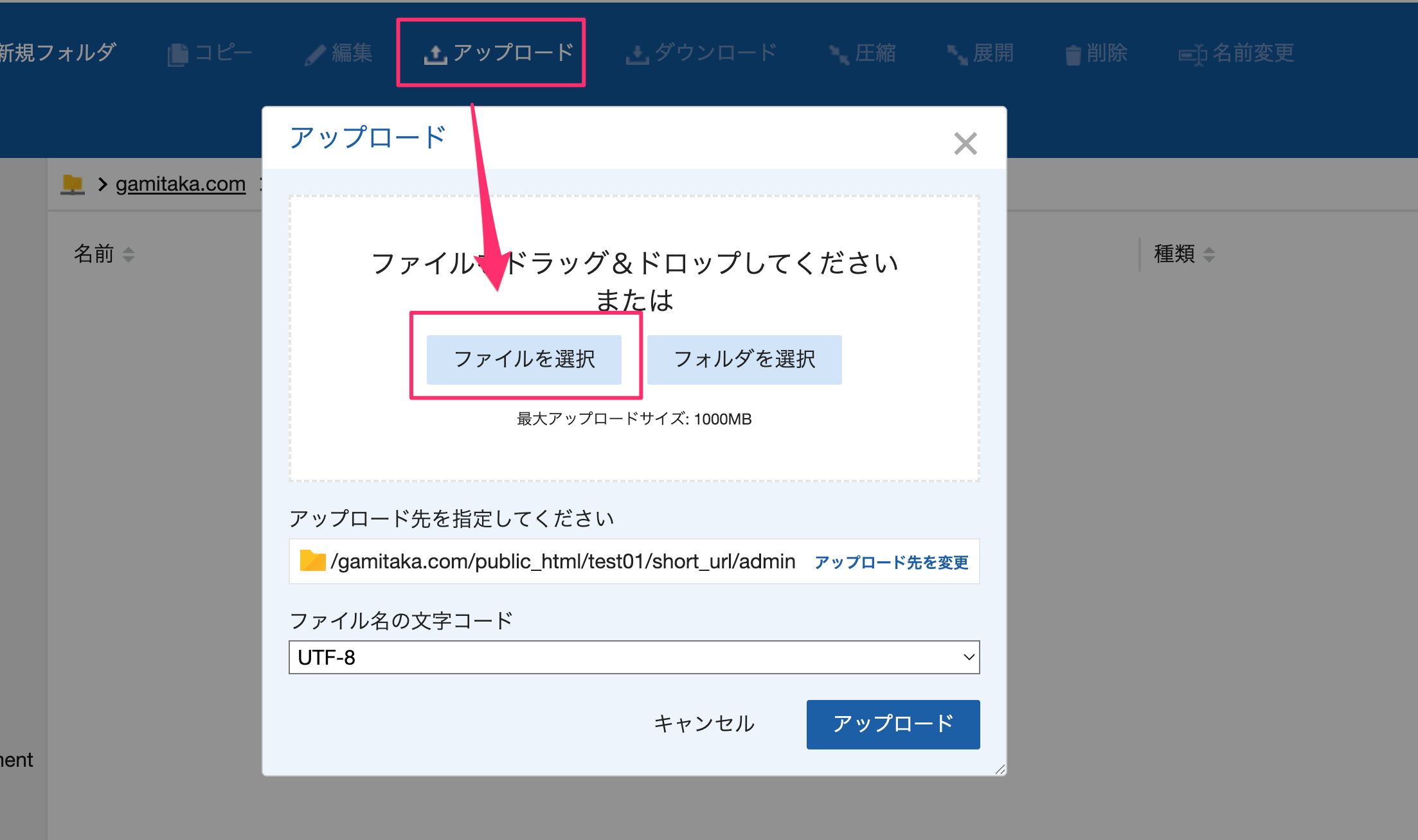 10.「admin」フォルダの時と同様に「アップロード」→「ファイルを選択」をクリック。