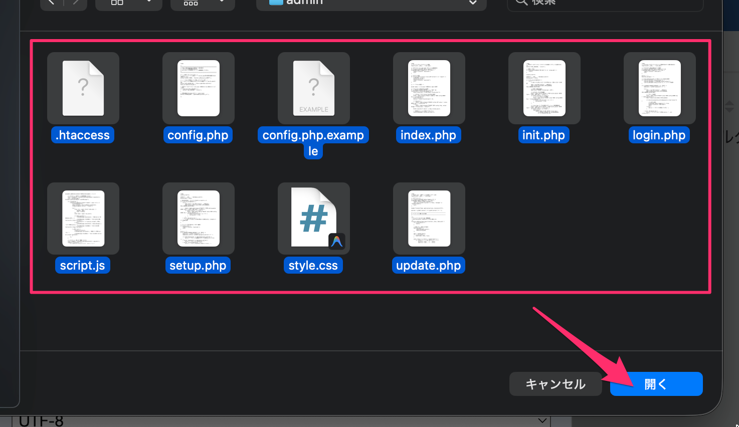 11.「.htaccess」と「index.php」を選択して「開く」をクリック。
