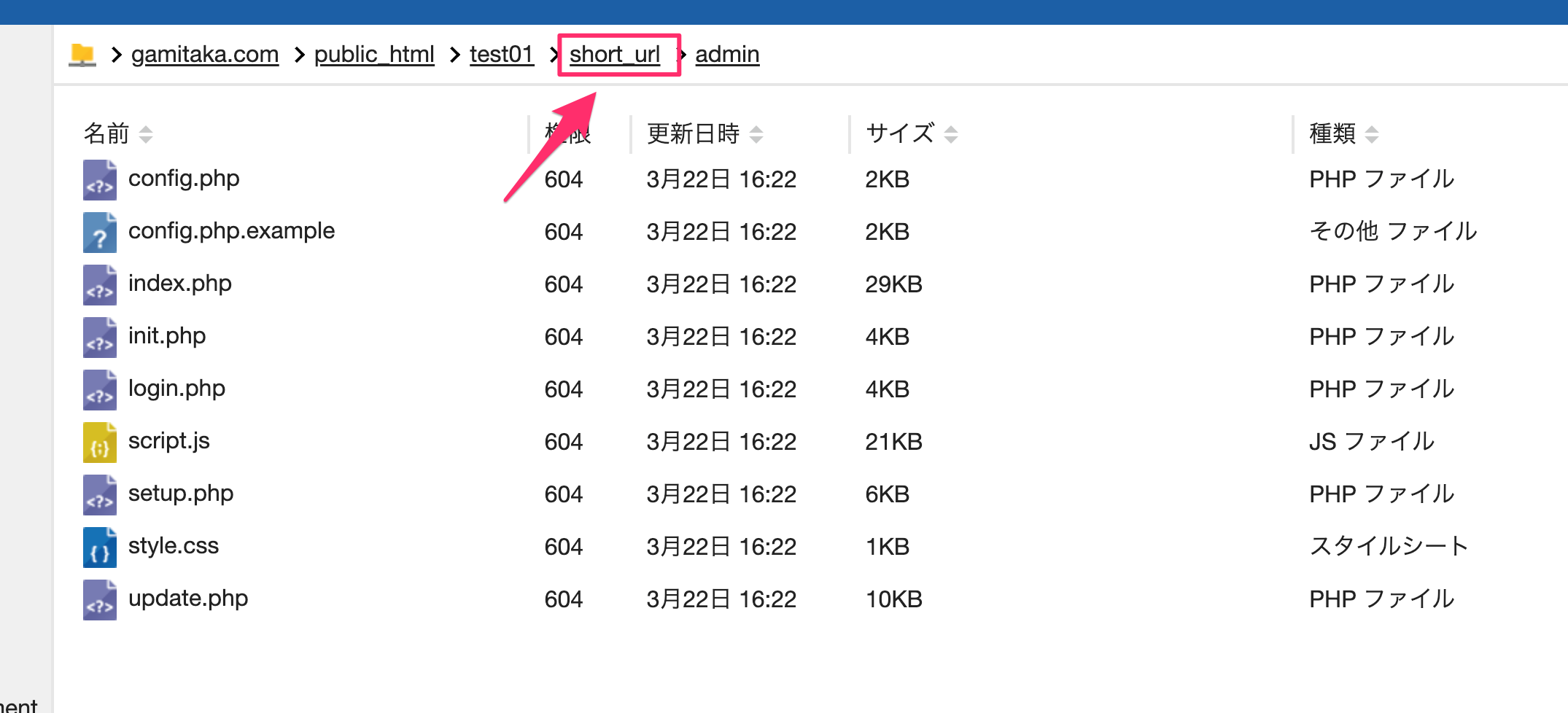9.アップロードができたら、一つ上のフォルダに戻ります(ここでは「short_url」)