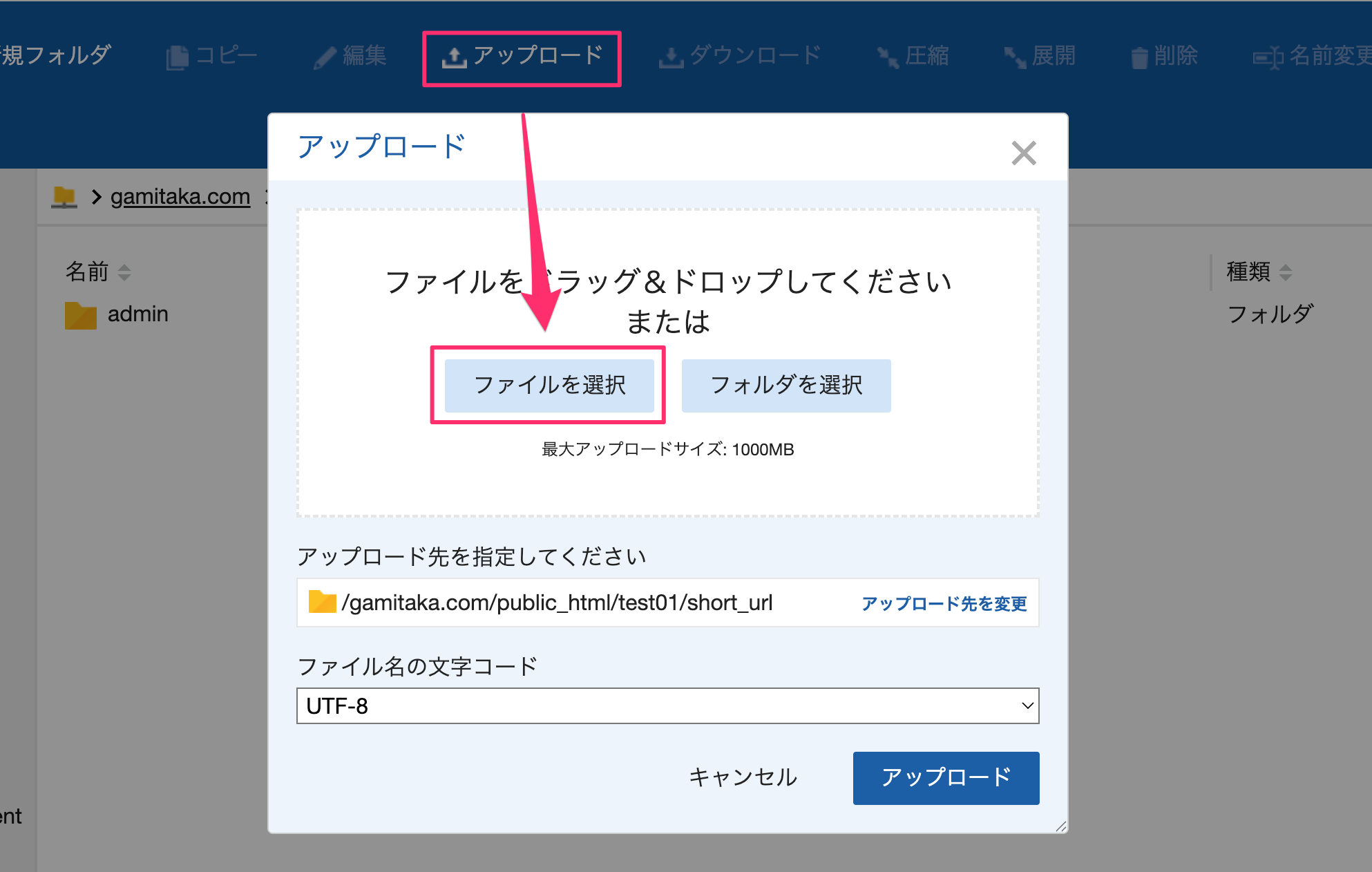 6.作成した「admin」フォルダを開き「アップロード」をクリックして「ファイルを選択」をクリック。