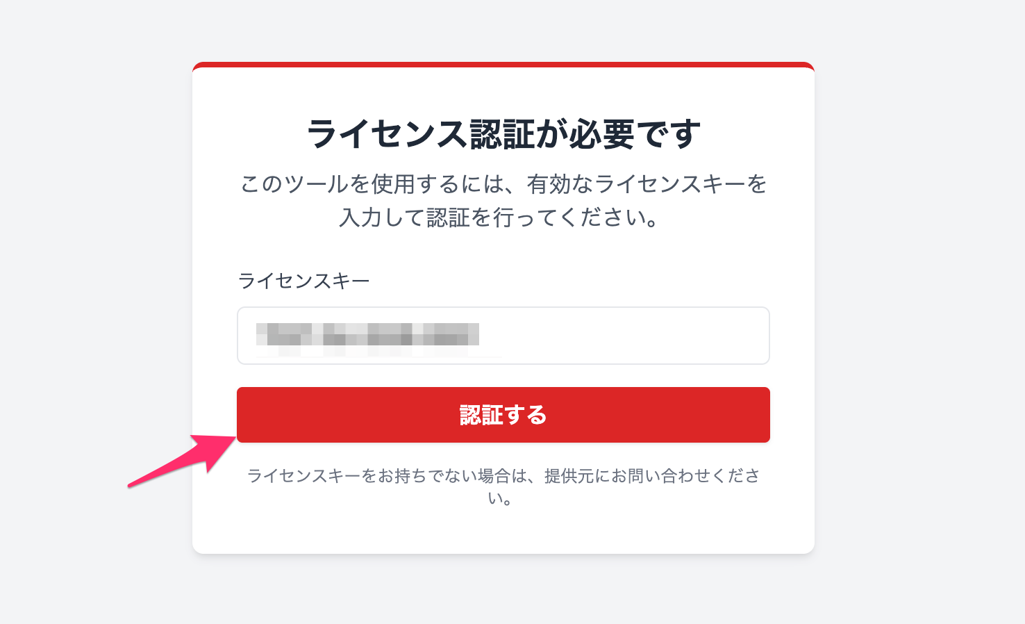 3.続いて、ライセンスキーの入力画面が表示されるので、購入時のメールに記載のライセンスキーを入力して「認証する」をクリック。