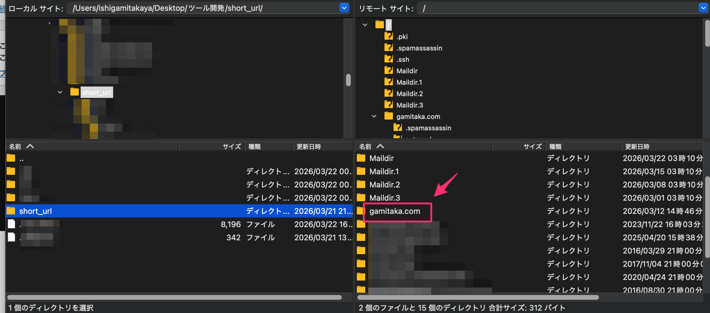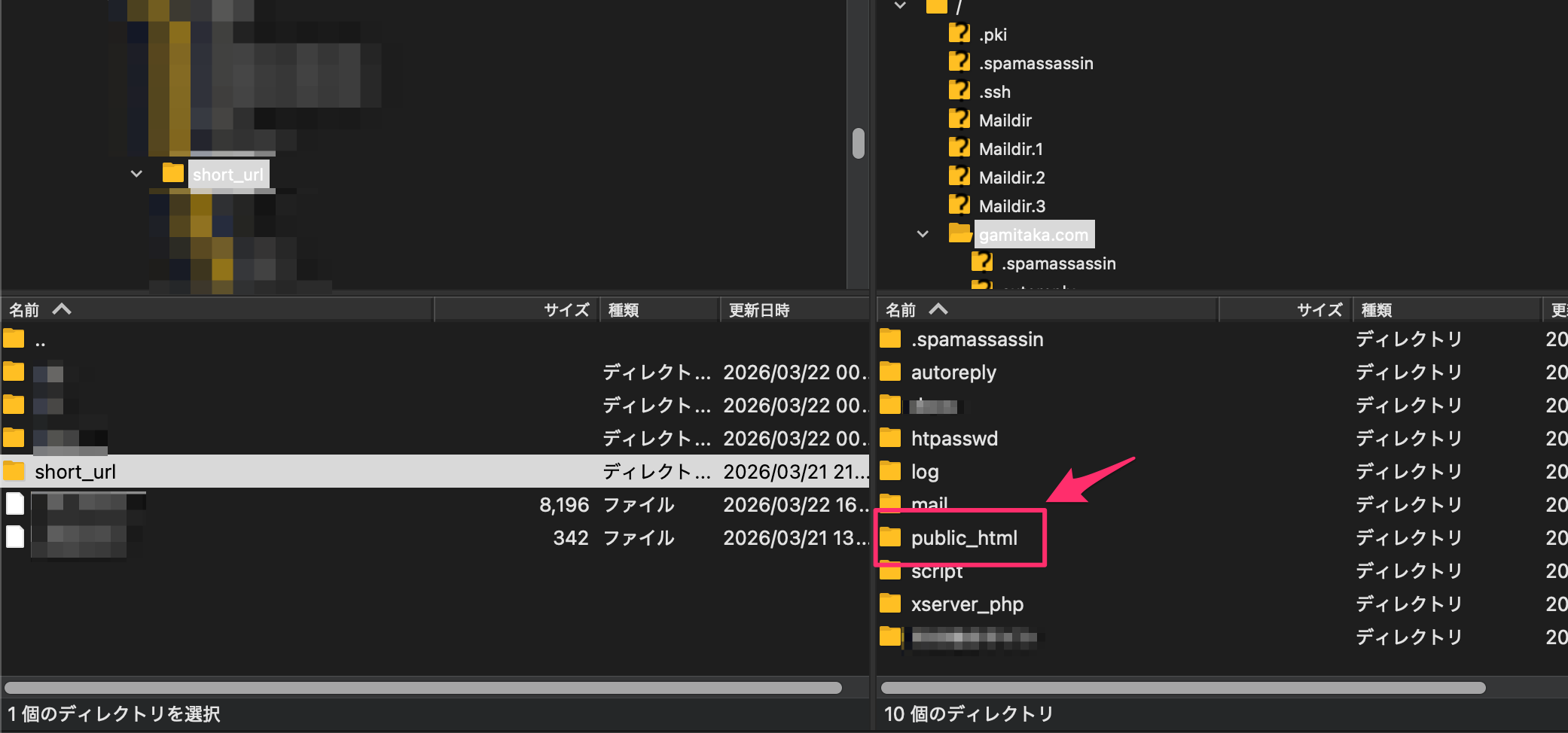1.左側(PC側)は解凍した「short_url」のフォルダを開き、右側(サーバー側)は「設置するドメイン」のディレクトリを開く。