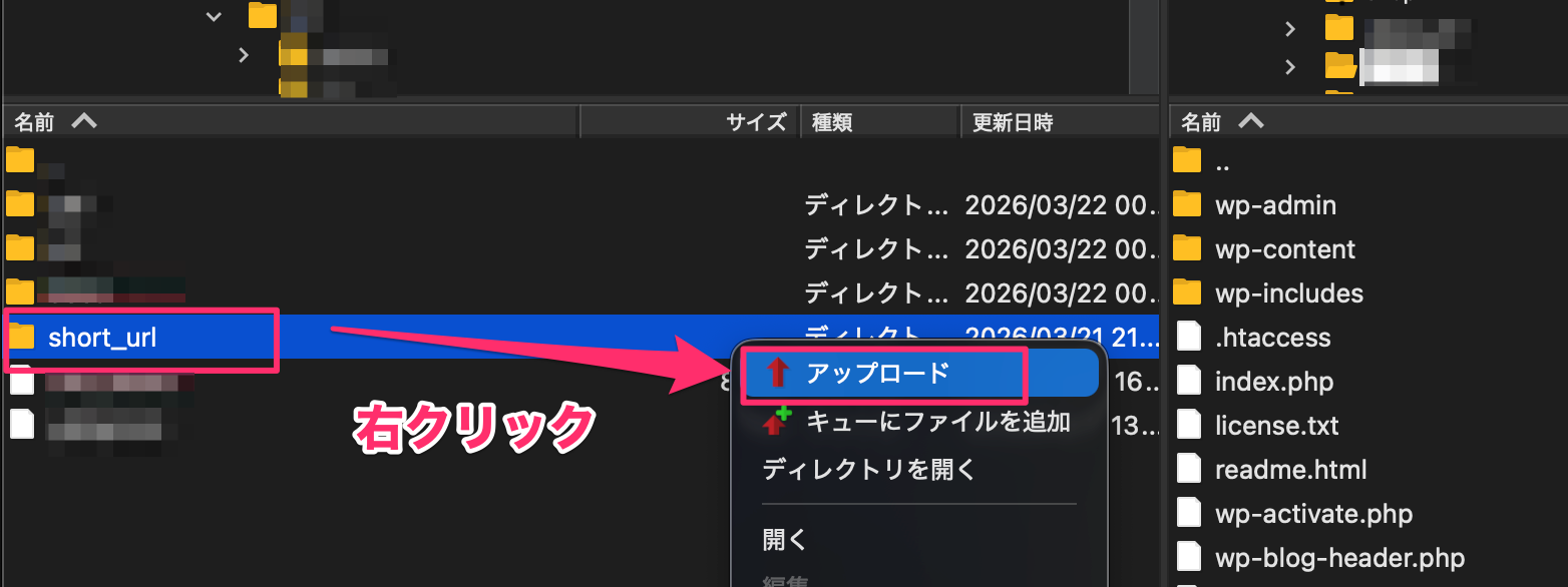 3.PC側の「short_url」のフォルダをサーバー側にドラッグ&ドロップでアップロードできますが、「右クリック→アップロード」でもアップロードできます。