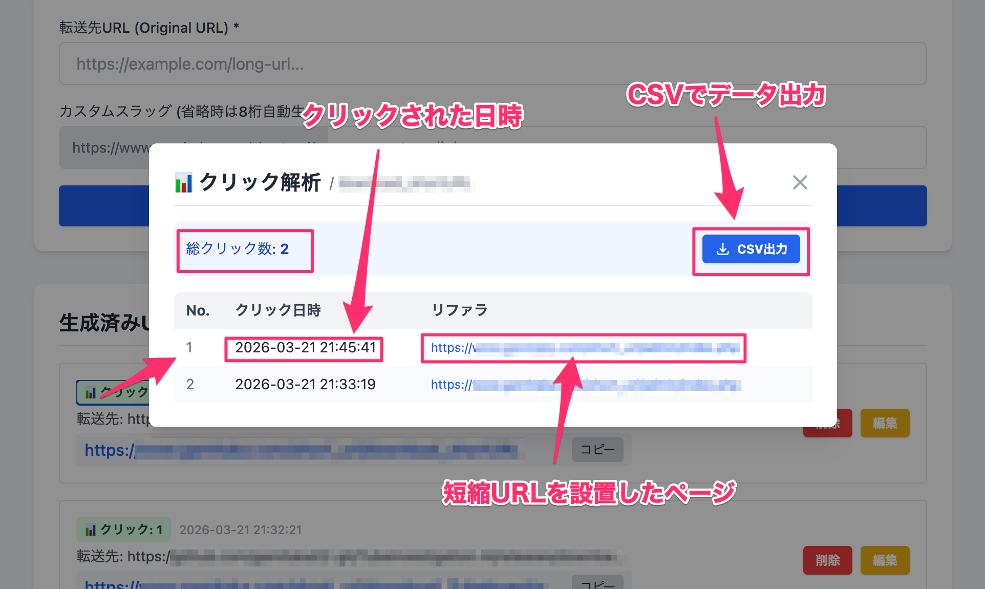 - モーダルウィンドウが開き、「総クリック数」「クリックされた日時」「リファラ」を確認できます。