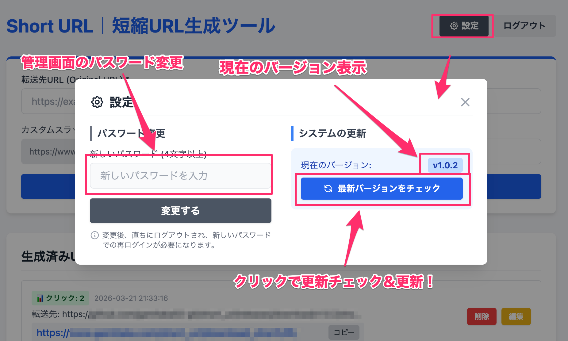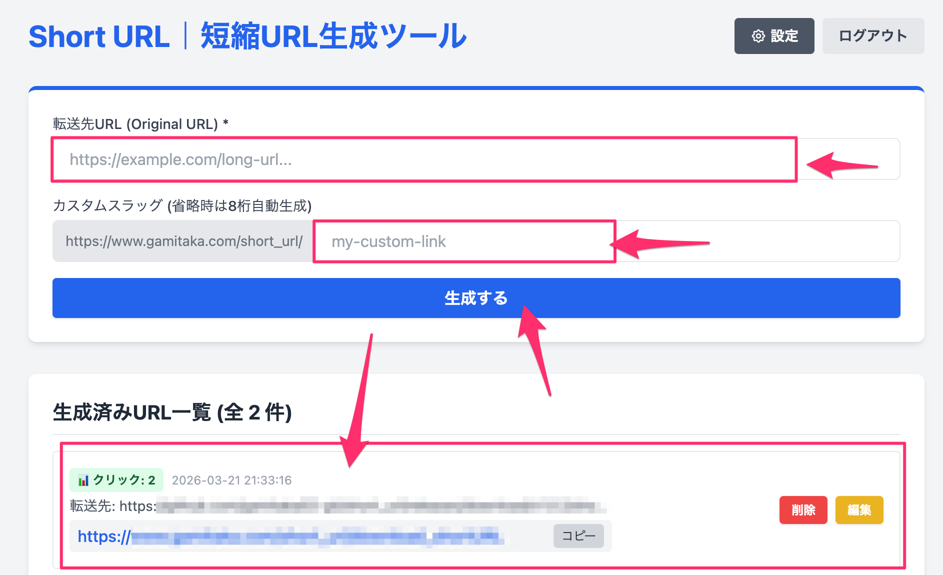 - 生成済みURL一覧に表示され、右側のボタンで「短縮URLの削除」「短縮URLの編集」ができます。