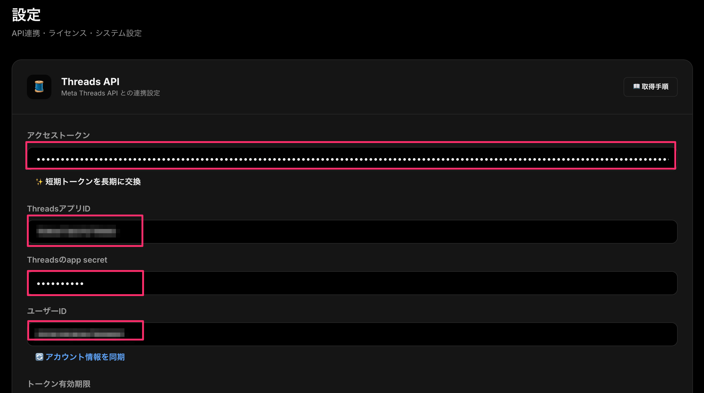 - Threads API関係(アクセストークン、アプリID、app secret、ユーザーID)