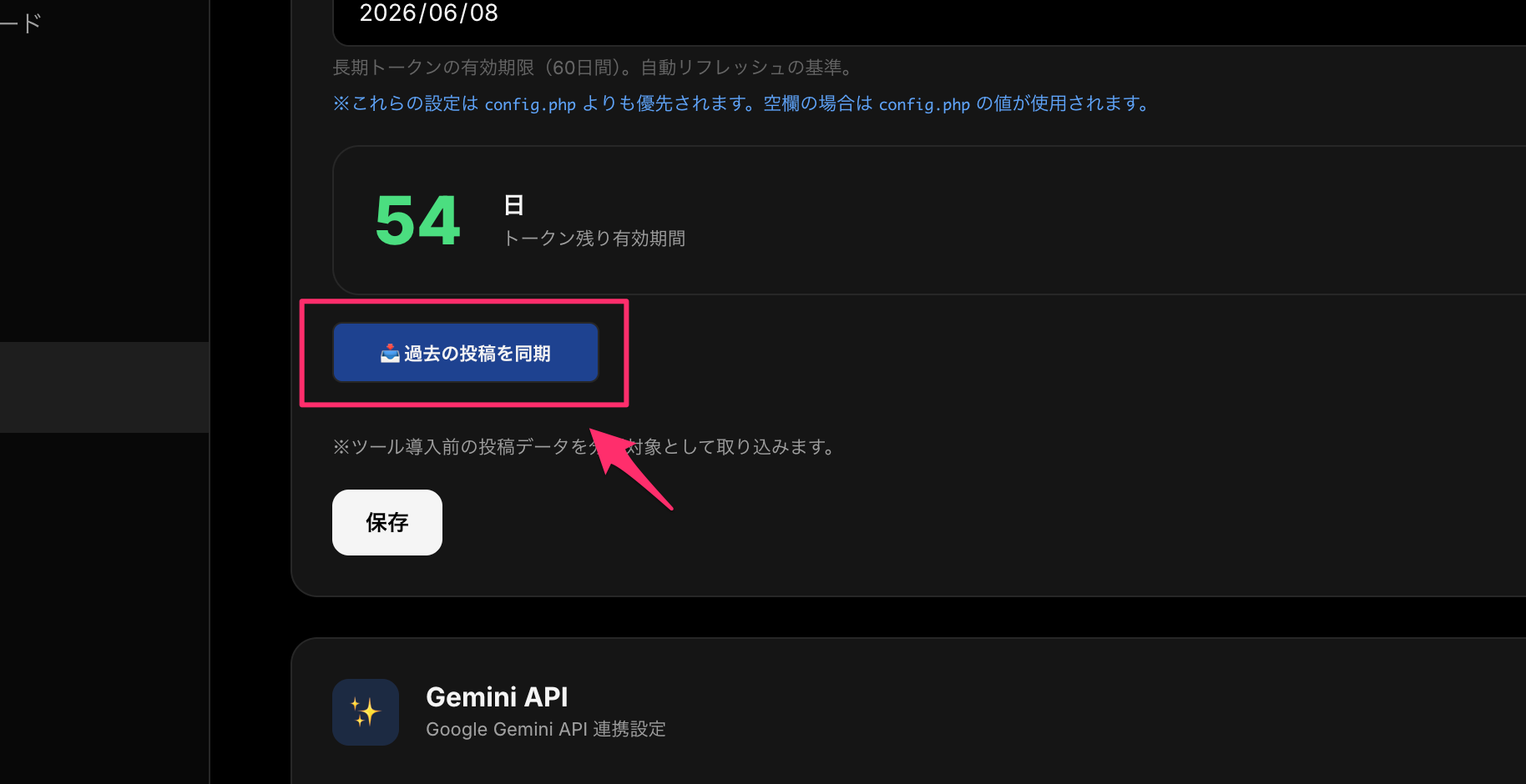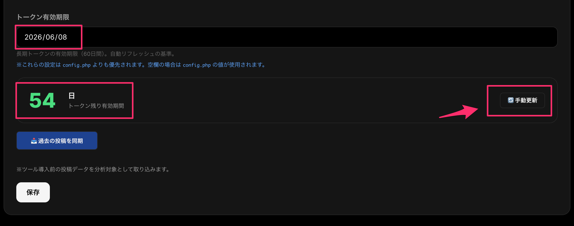 また、トークンの有効期限と残り日数が管理画面で常に確認できます。更新のタイミング(10日前あたり)になれば自動で更新してくれますので、一応表示はしていますが基本的には気にしなくて大丈夫です。(手動でも1クリックで有効期限を更新できるので、不安な方はインストール後2〜3日経ってから手動でやってみてください)