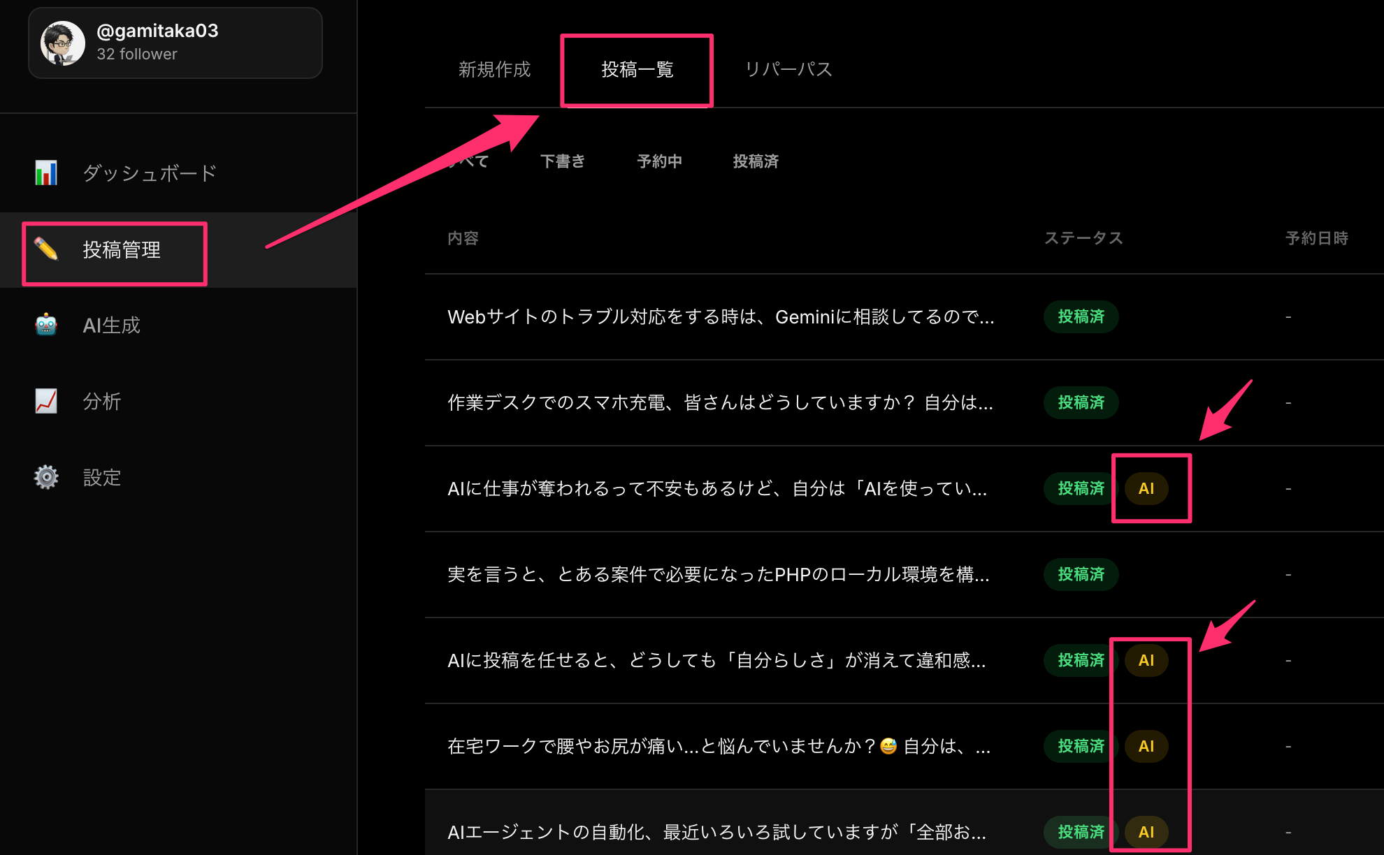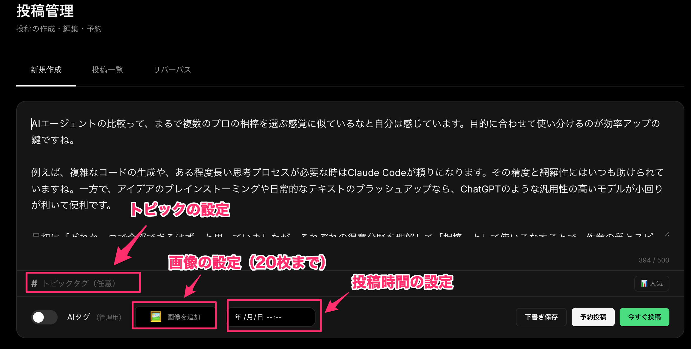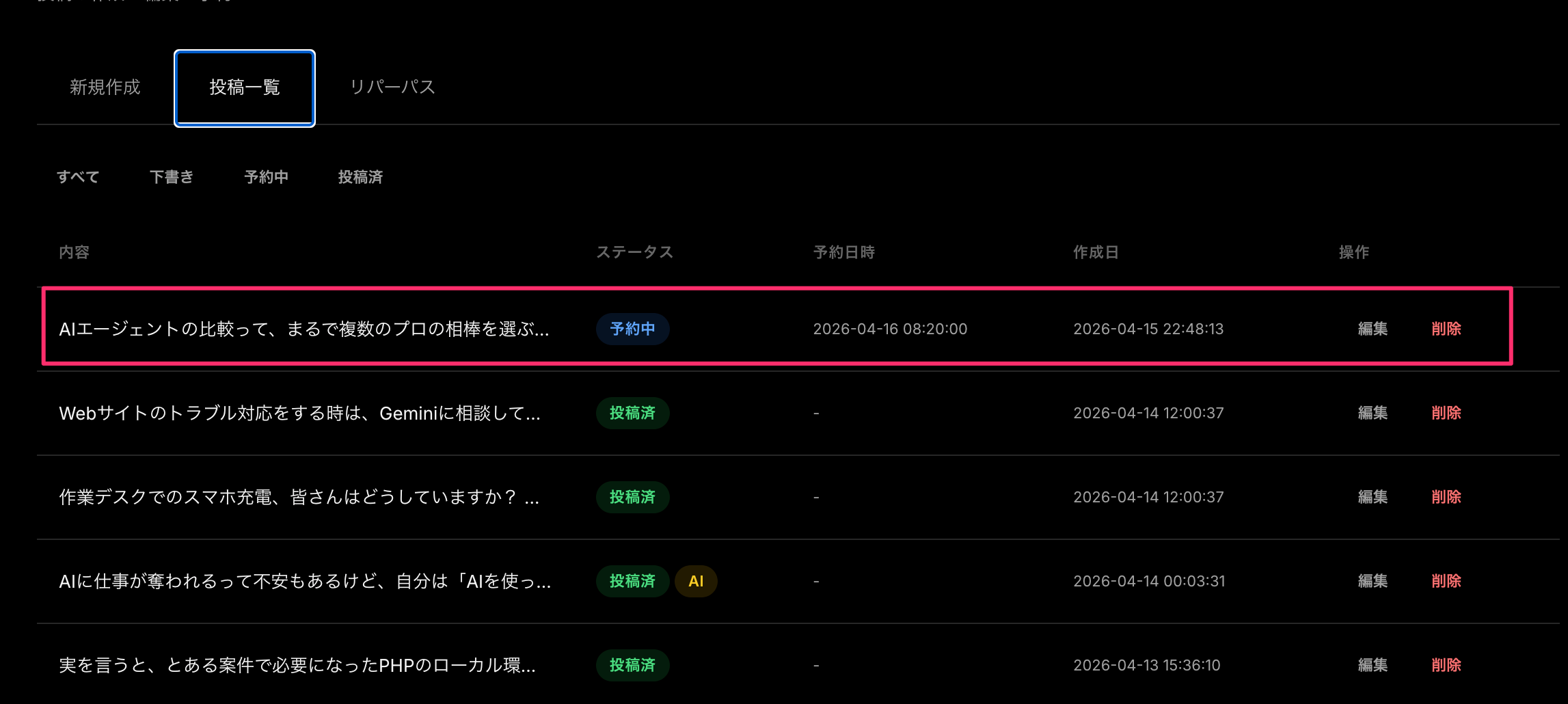 投稿前であれば編集することもできますし、生成→修正を繰り返すことで複数の投稿を予約できます。