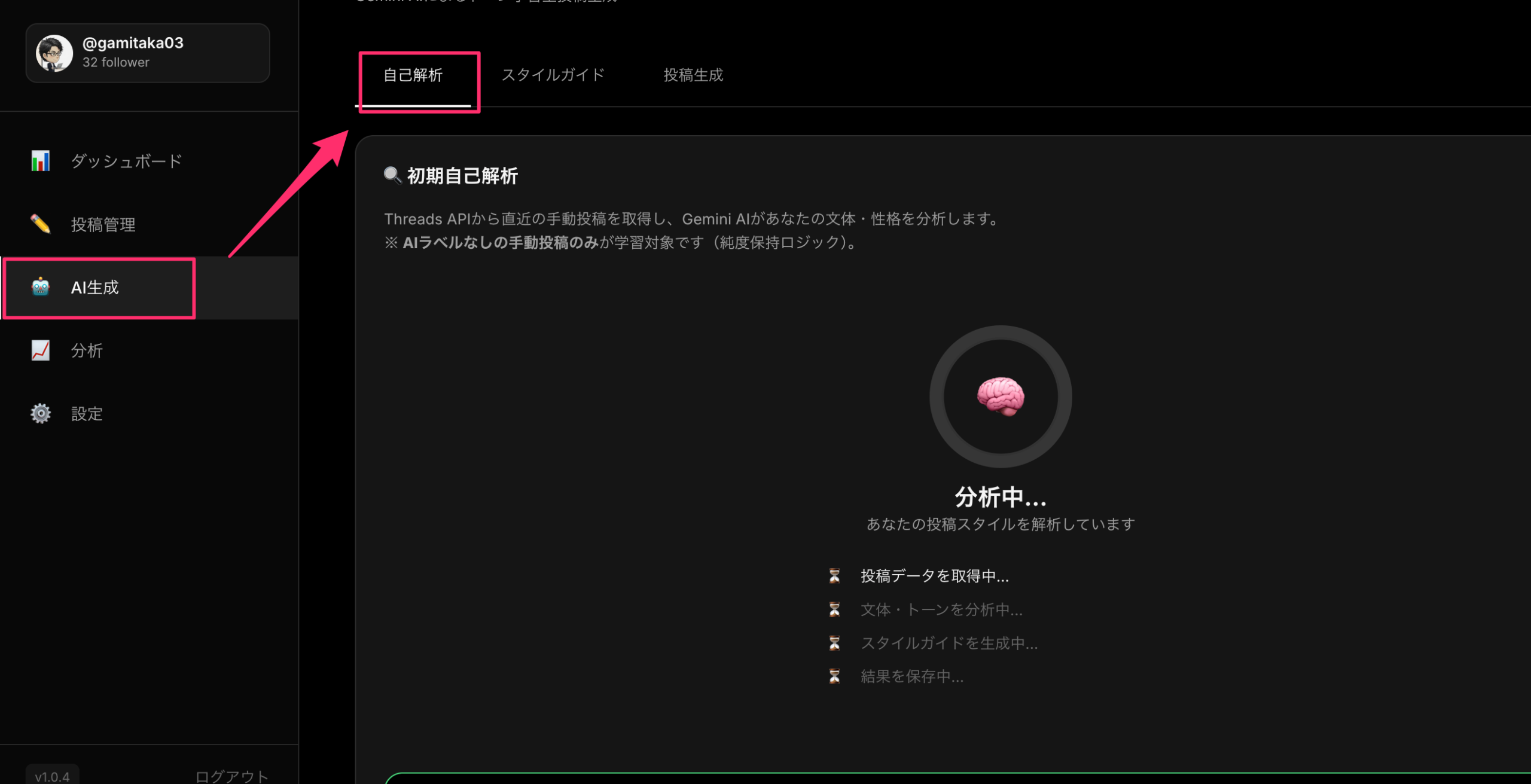 過去の投稿を取り込んだら、それを元に「自己解析」を行います。