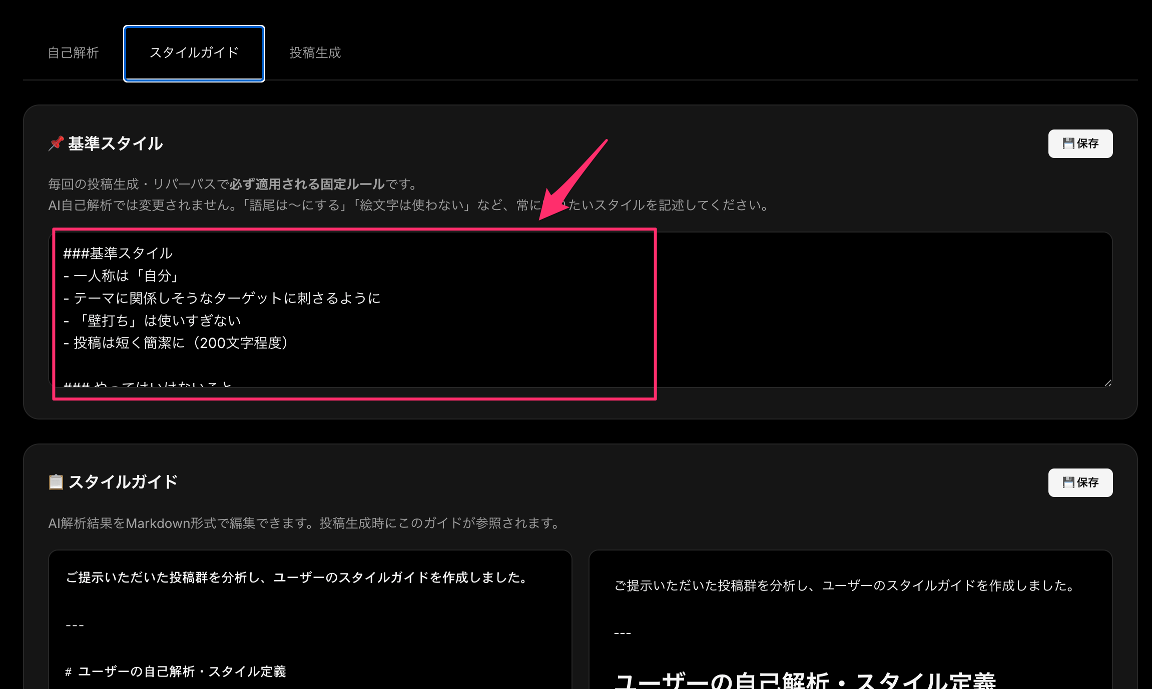 「スタイルガイド」には、あなたの投稿から読み取った以下のような情報が言語化されています。