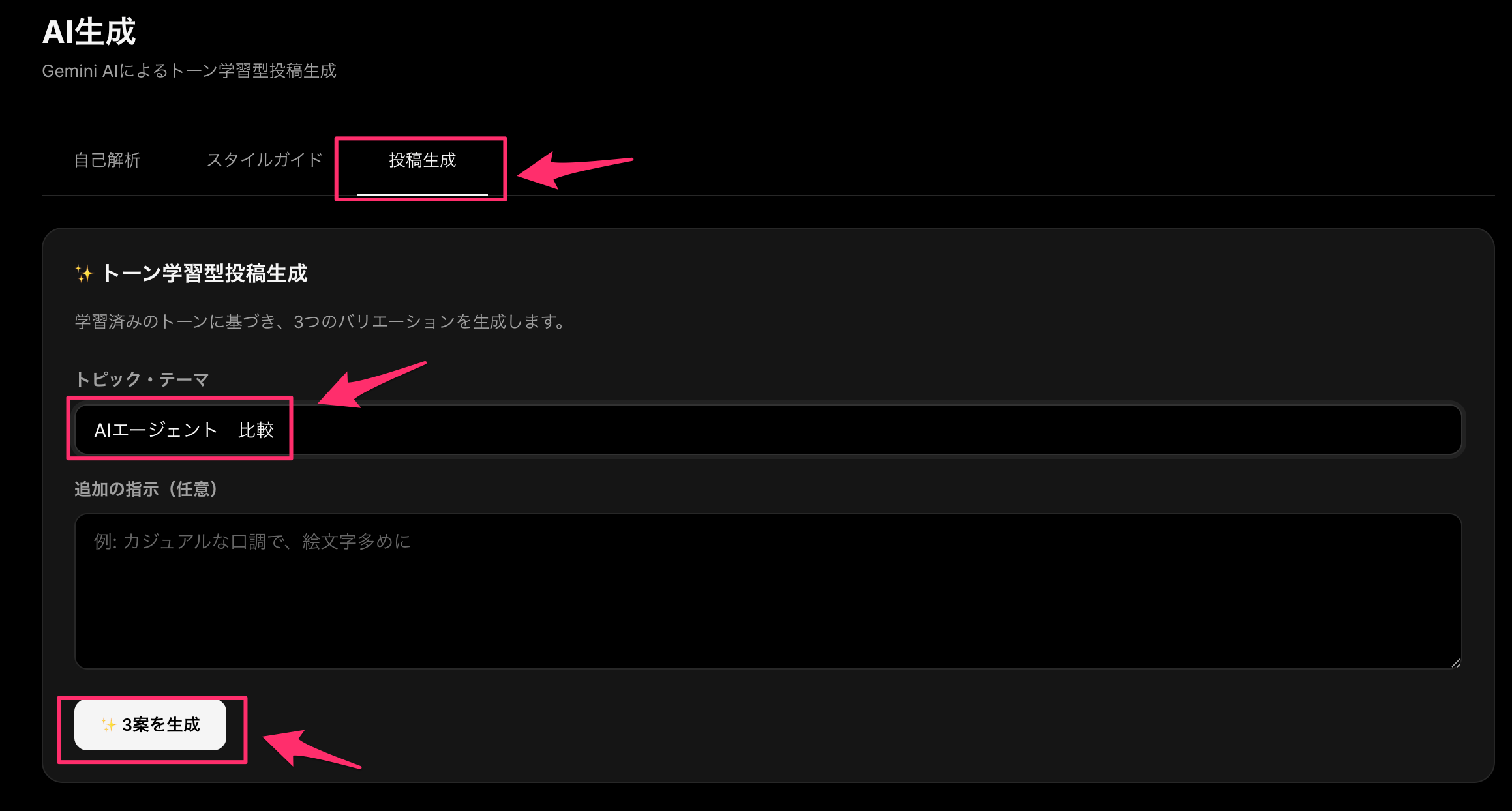 あなただけの「スタイルガイド」ができたら、いよいよ投稿の下書き生成です。