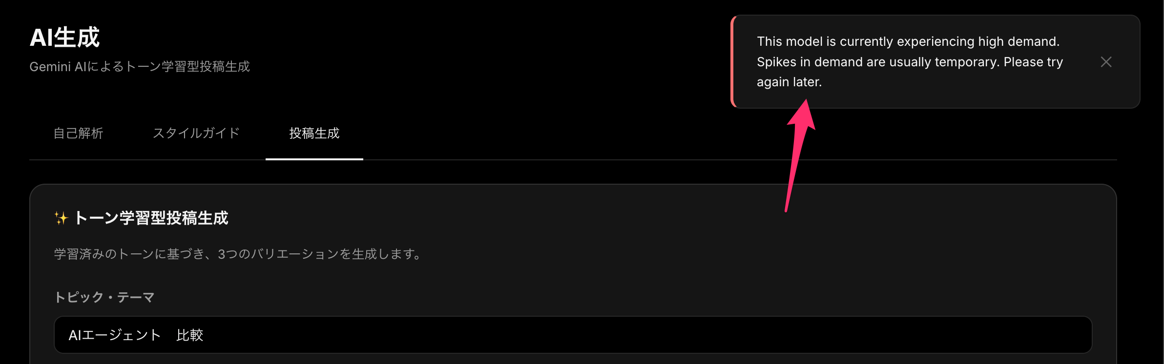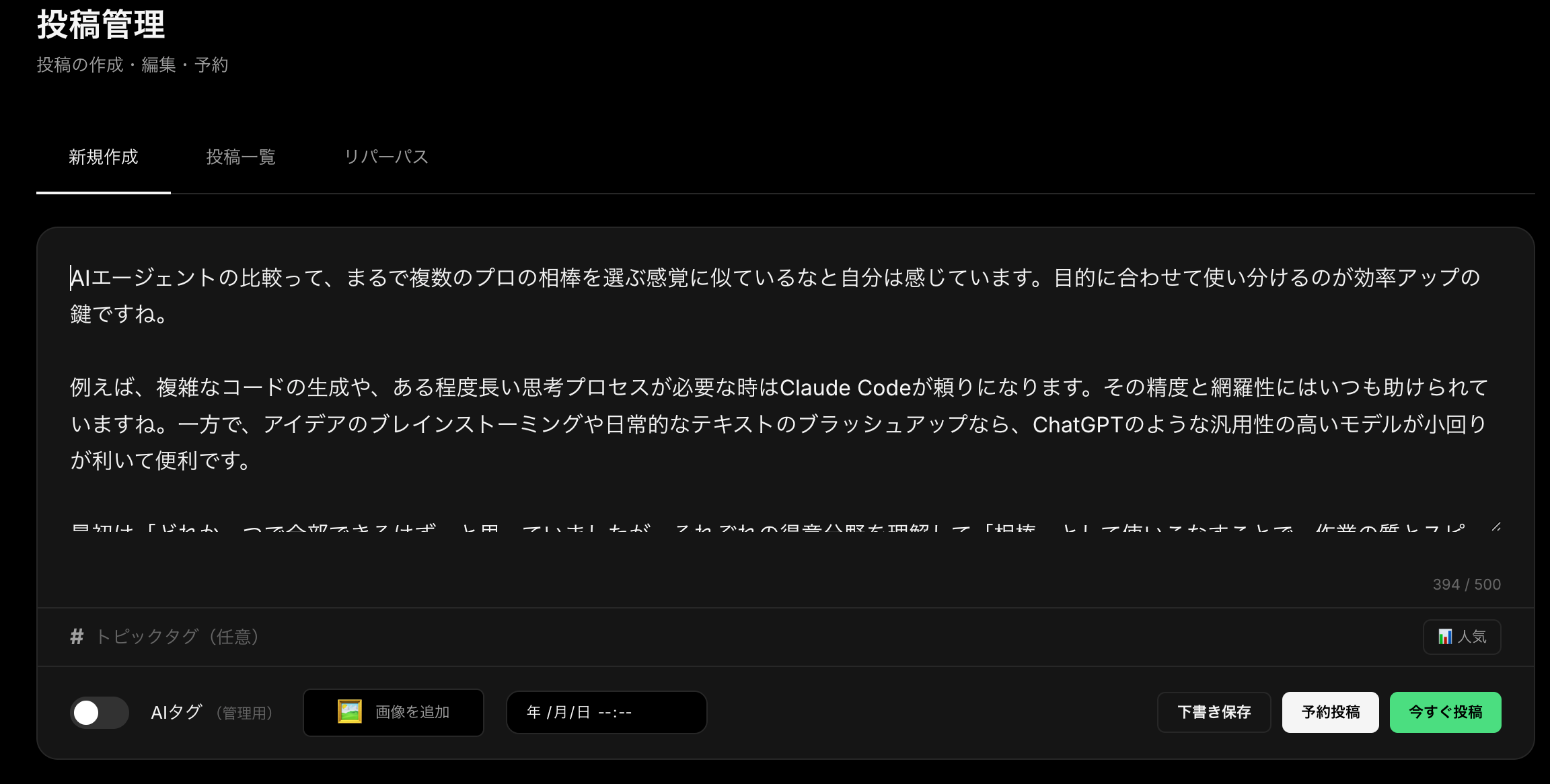 自分の言葉で書いた投稿が増えるほどスタイルガイドの精度が上がるので、使い続けるほど自分らしい下書きが出てきます。(定期的に自己解析を回してください)