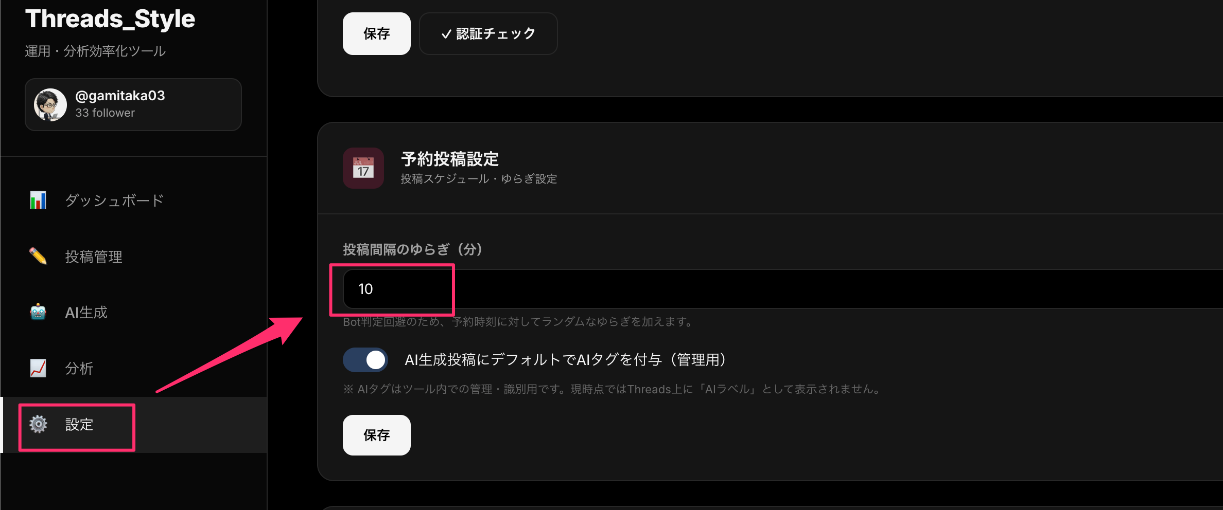 ツールを使って投稿する際は、ゆらぎ設定をオンにすることをおすすめします。設定した時刻から数分程度のランダムなズレを自動で加えることで、機械的な投稿パターンによるBot判定を防ぎ、自然な投稿リズムを保てます。
