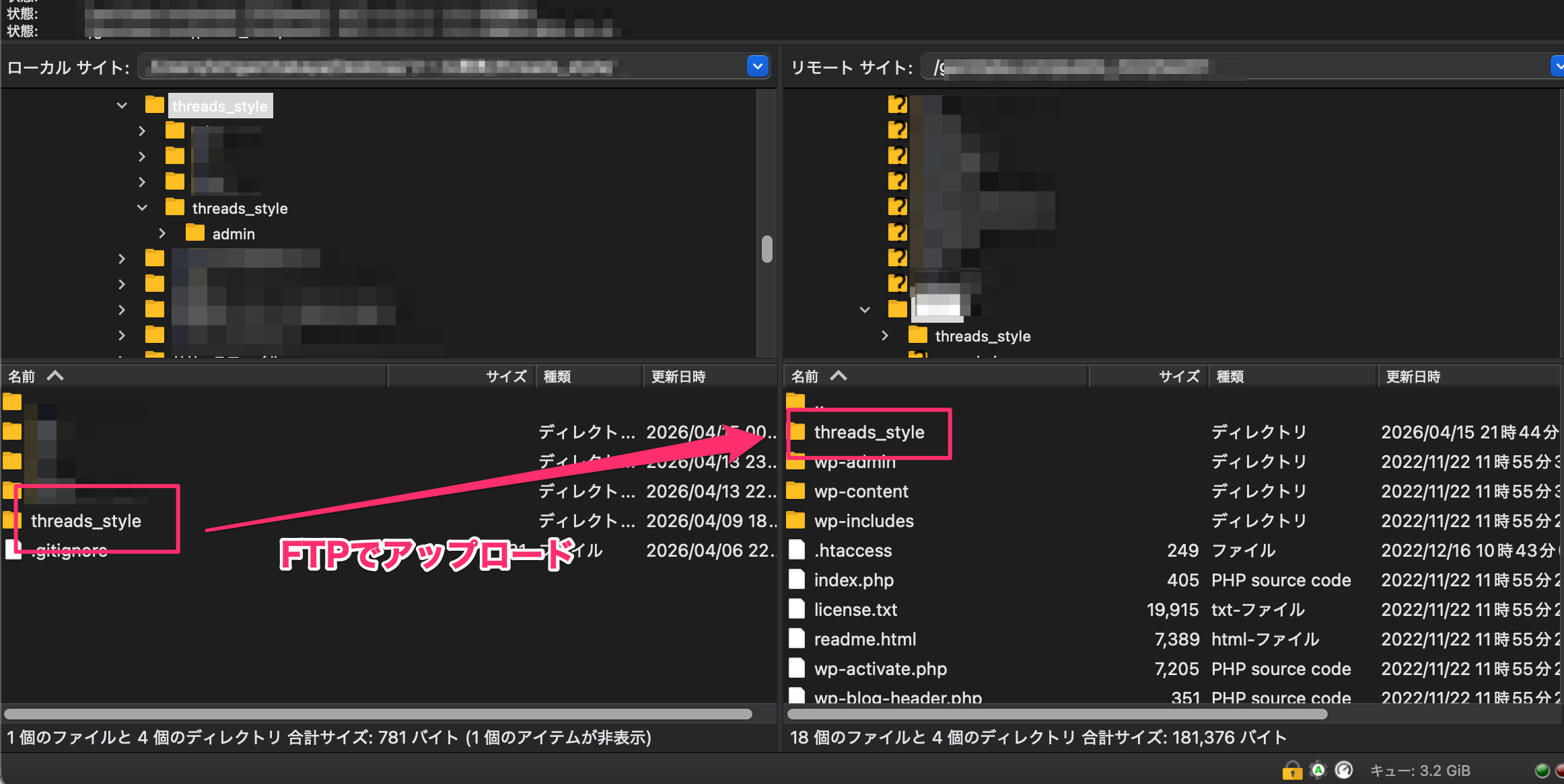 ZIPファイルを解凍すると、Threads_Style のファイル一式が入っていますので、FTPツールを使ってレンタルサーバーの任意のディレクトリにアップロードしてください。
