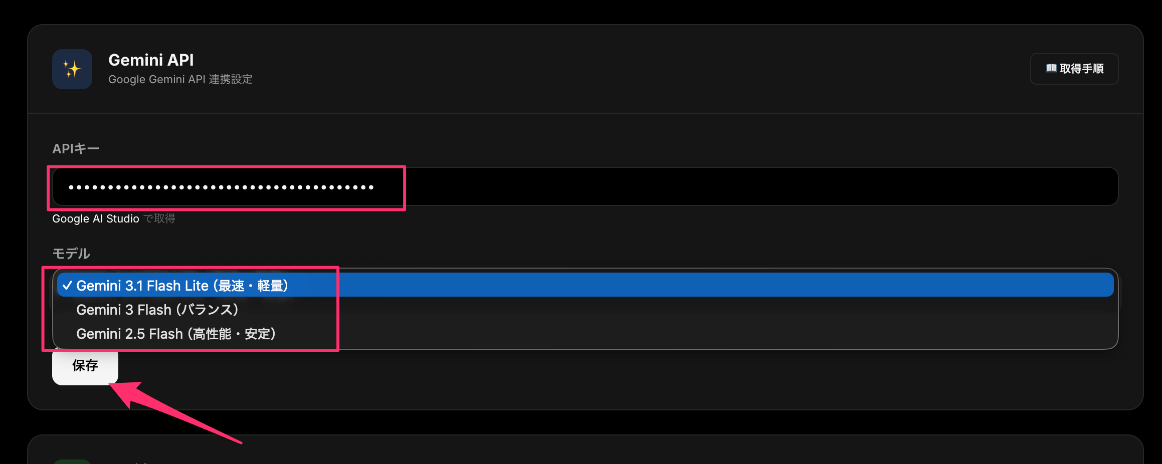 取得したAPIキーは「設定」タブ内の「Gemini API」に入力します。